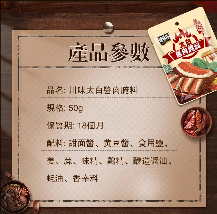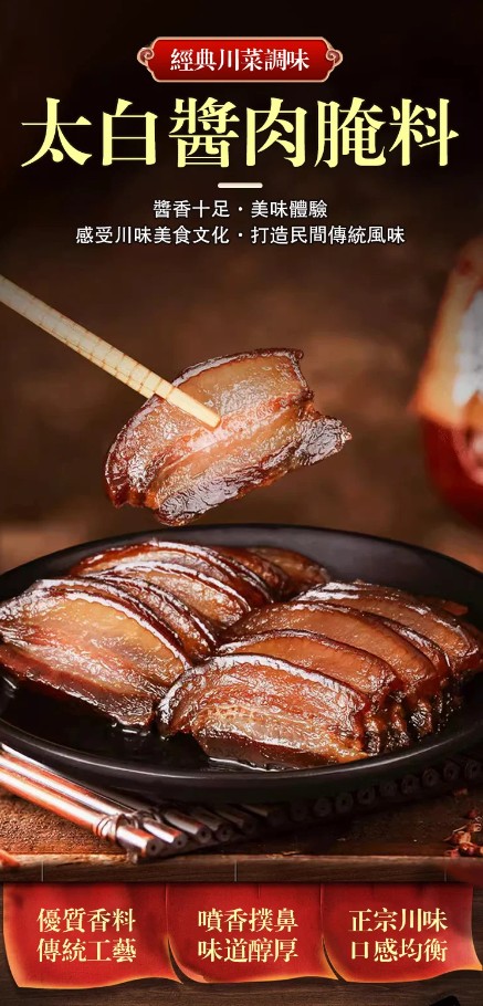 7分鐘前【一袋做6斤】太白醬肉醃料廚師兄川味風乾臘肉料300g/袋醬排骨猪肝 - 新品嘗鮮【太白醬肉醃料 300g/袋】3入組NT$980
